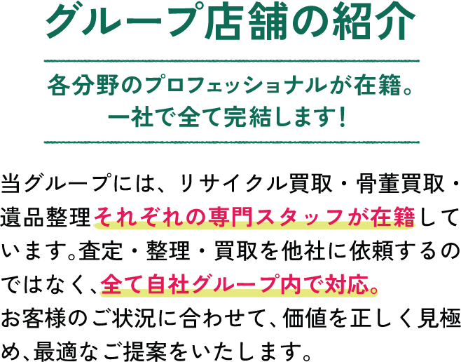 買取可能なものは高価買取し、再利用できない不用品は回収処分までまとめて対応可能です。遺品整理・生前整理での一括対応をご希望のお客様にご好評いただいています。